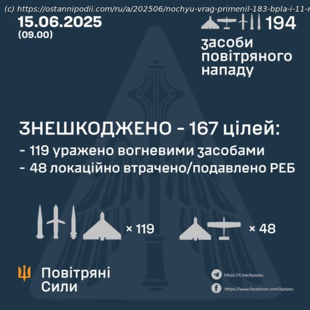 В ночь на 15 июня рашисты атаковали Украину 194 средствами воздушного нападения, в т.ч. двумя «Кинжалами». Обезврежено 167 целей.