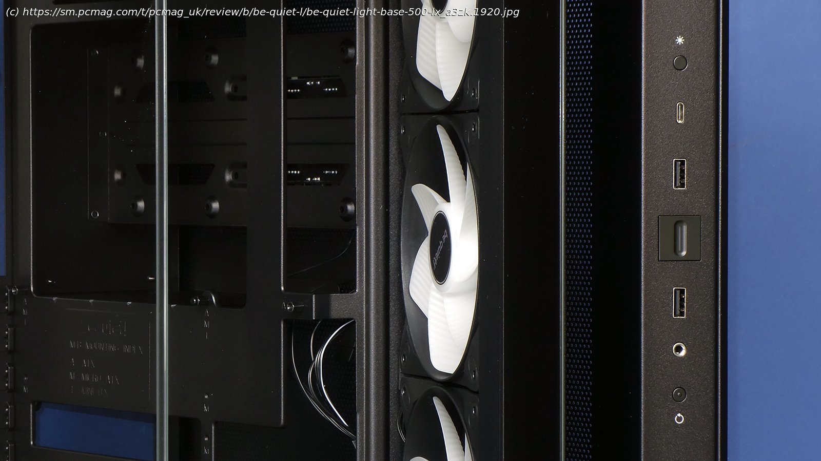 Though even the most minor changes can make a product stand on its own, the efforts Be Quiet made to make its angled corner intake fans a brand exclusive are far more noticeable. Rather than chop off one corner of the case like we saw in the NZXT H9 Flow or the APNX V1, the designers filled the corner with a vertical bar and extended the side panel to cover the gap from that angle. The front panel’s gap remains as a styling cue, and the vertical bar delivers some function by housing the case’s ARGB-mode button, USB 3.x ports, backlit power button, headset jack, and reset button.