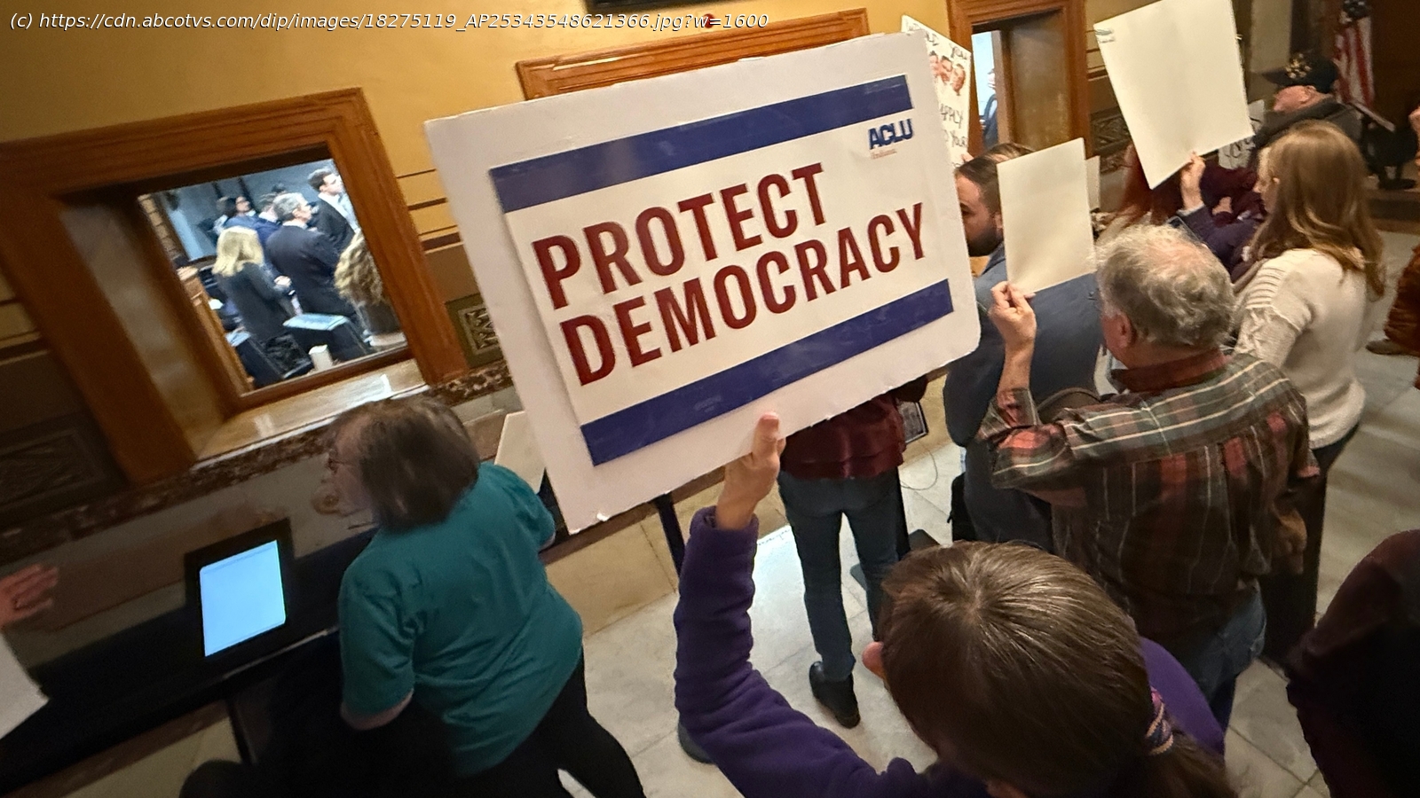 Outside the state Senate chamber, redistricting opponents chanted „Vote no!“ and „Fair maps!“ while holding signs with slogans like „Losers cheat.“