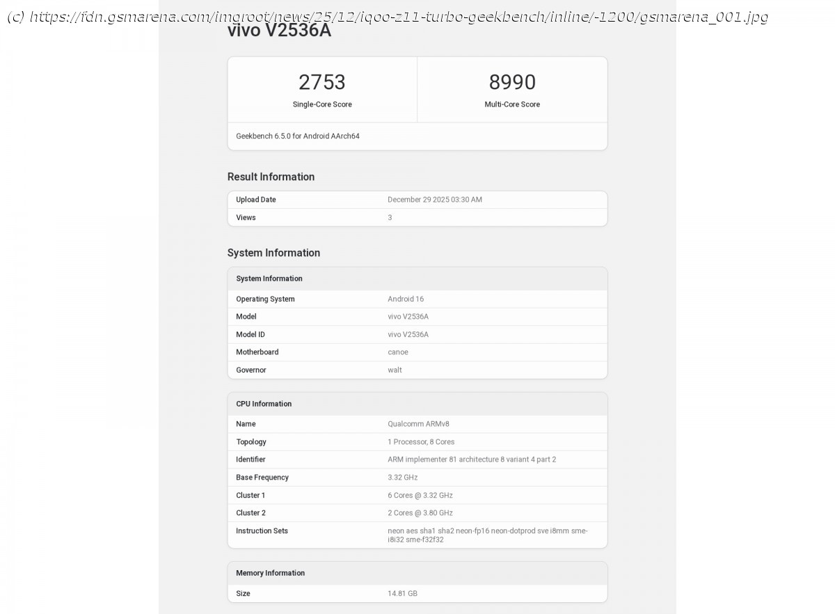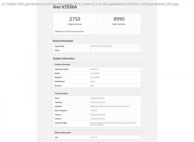The iQOO Z11 Turbo is coming soon to China, and a few days ago the brand revealed its rear design. Now, the phone has been spotted in the Geekbench database with the model number V2536A.