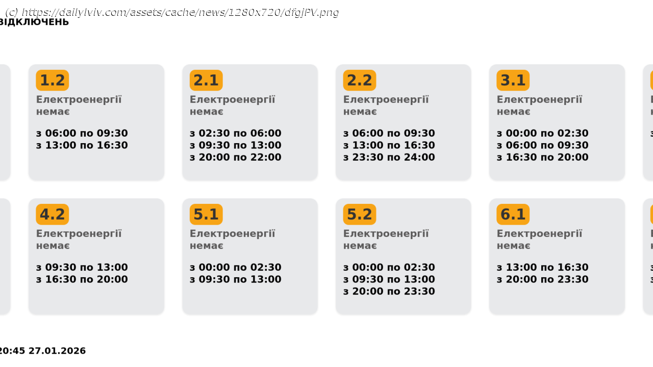 Графік на Львівщині 28 січня. Найбільша кількість одночасних відключень вранці та ввечері. Інформація станом на 20:45 27.01.2026.