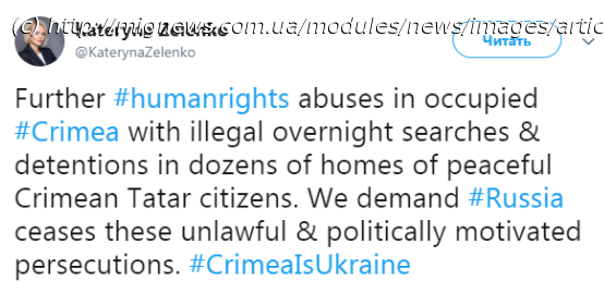 В своем в Twitter-аккаунте она отметила, что на территори полуострова продолжаются незаконные обыски и задержания.