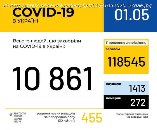 По данным ЦОС, по состоянию на 9:00 1 мая в Украине 10861 лабораторно подтвержденный случай COVID-19, из них 272 летальных, 1413 пациентов выздоровели.