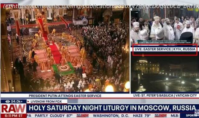 20 апреля во время трансляции праздничных богослужений из разных стран мира телеканал Fox News одновременно показывал кадры Пасхальной службы в Киеве и Москве.