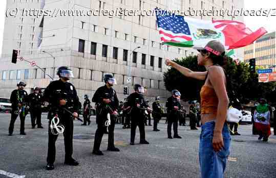On Sunday, Los Angeles police said some protesters had thrown concrete projectiles, bottles and other items at police. Los Angeles police say they made more than 100 arrests Monday evening and two officers were injured.