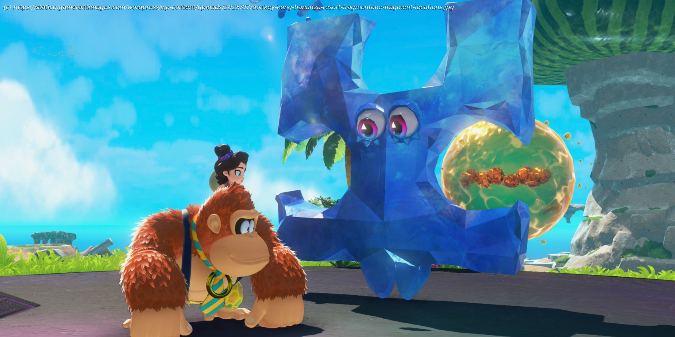 To find all three Fragmentone fragment locations in Donkey Kong Bananza’s Resort layer, look inside nearby large fruits and on a floating island.