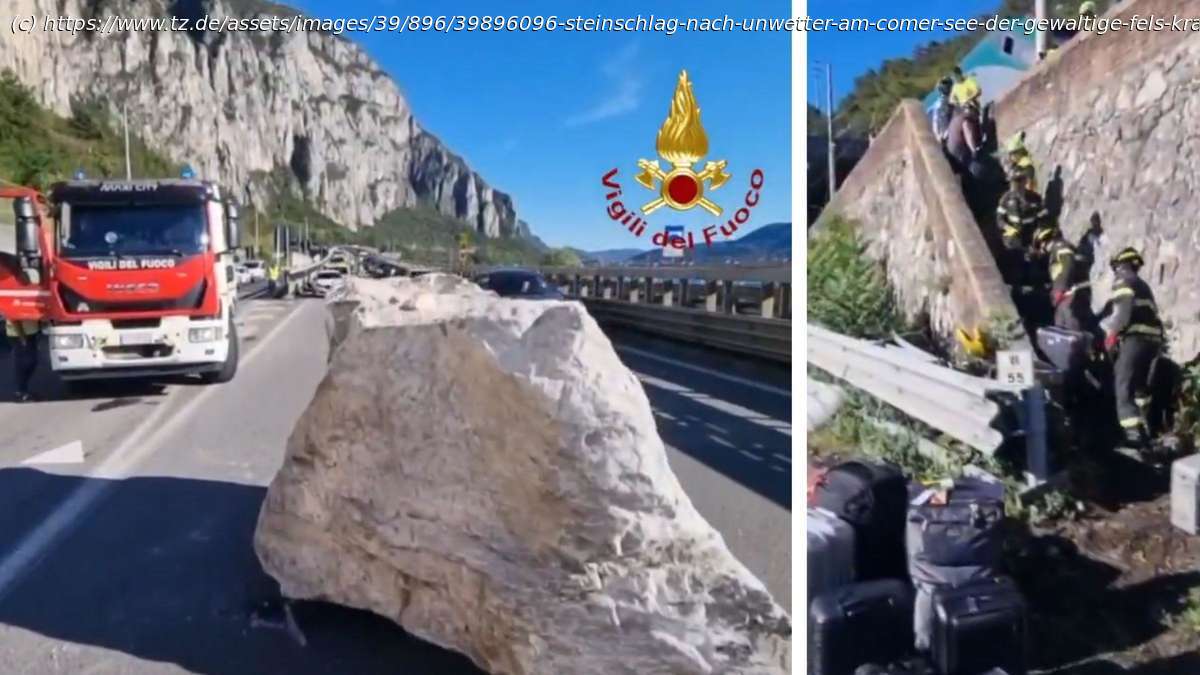 Deutschland — in German Heftiger Steinschlag direkt an Italien-See: Zug prallt in Brocken, Fels landet mitten...