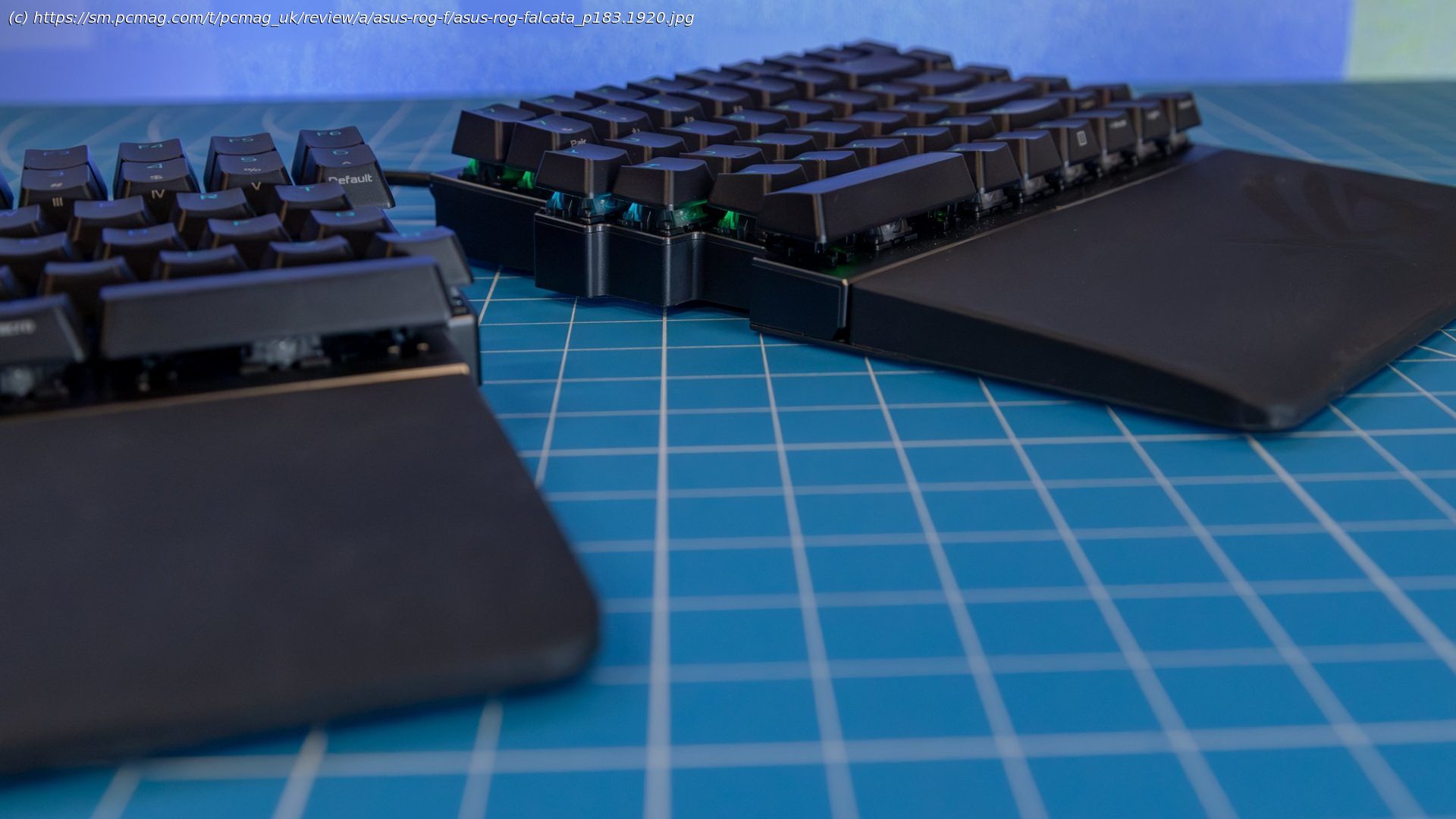 The Asus ROG Falcata comes in a fairly large box in order to accommodate its large wrist rests. Without the rests and with the halves attached to each other, the board measures 1.5 by 12.9 by 5 inches (HWD). This makes the Falcata slightly smaller than the similarly designed Keychron Q11 we reviewed in 2023. It’s slightly lighter, too, at 2.13 pounds compared with the Q11’s 2.61 pounds.