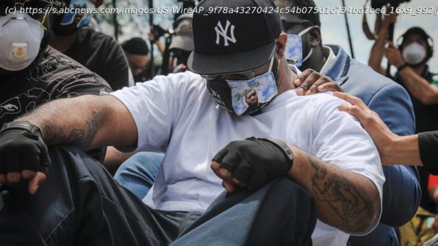 Wearing a face mask with George’s Floyd’s image on it, his brother Terrence Floyd dropped to his knees at the storefront that has been turned into a memorial covered with flowers and signs. As he kneeled silently, many who were around him joined him on the ground.