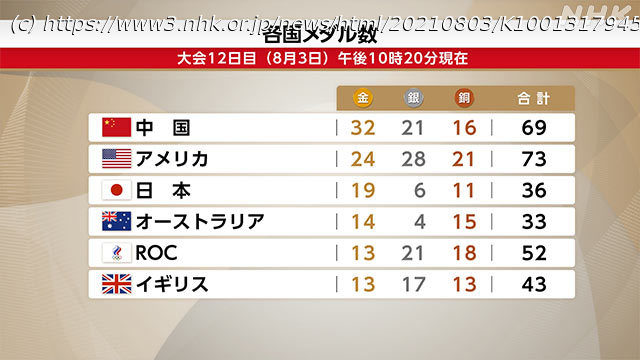 東京オリンピックの大会12日目で、日本は体操の男子種目別、鉄棒で橋本大輝選手が、ボクシング女子フェザー級で入江聖奈選手が、それぞれ金メダルを獲得するなど、合わせて3個のメダルを獲得しました。