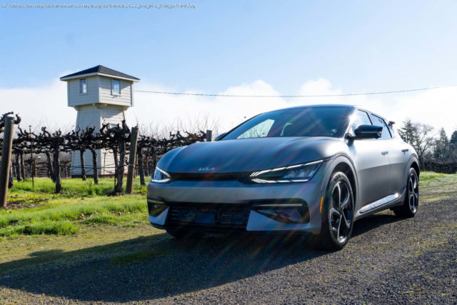 “Whoa.” That’s the actual word that escaped my lips when I first engaged Sport mode on the EV6. It could be used to describe most of my experience with the vehicle during a first drive event, though. Kia’s move from entry-level car maker to mid-market darling with the help of the Telluride SUV continues with its latest offering. The EV6 showcases the evolution of not only the brand, but its EV offerings. The EV6 is a larger-than-you-expect vehicle that Kia calls a CUV (Crossover Utility Vehicle) with the space of an SUV and the driving stance of a sedan. Everything about it is more than you anticipate. While other automakers have been crowing about their move to EVs with their first vehicles over the past few years, Kia has been in the game for a few generations. From an electric version of the Soul to the Niro EV, the Korean automaker has been busy. Recently, the Hyundai Motor Group (the parent company of Kia) introduced an EV architecture dubbed the E-GMP (Electric Global Modular Platform). The EV6 is the inaugural Kia on that battery and powertrain system, while Hyundai has its own Ioniq 5. In photos, both vehicles look smaller than what you experience in real life. The reality is that the EV6 has the exact same wheelbase as the Telluride at 114.2 inches. The illusion is pulled off thanks to the wheels being pushed to the edge of the vehicle. So while it might look like a compact hatchback, it’s actually closer in dimensions to a mid-sized sedan, with a length of 184.3 inches — only an inch and a half shorter than a BMW 3 Series. Its real-life size isn’t the only surprise. Frankly, the EV6 delivers likely far more than most people expect from Kia. While driving the all-wheel-drive and rear-wheel-drive versions of the GT trim level in Northern California, it’s clear that the Korean automaker is ready to take on both the automotive upstarts and traditional OEMs. At the core of this performance is powertrain technology that in many ways has evolved above and beyond that of automakers like Mercedes. The most impressive part of E-GMP is that it’s an 800-volt architecture, which means that it charges quickly. The vehicle will support charging up to 350kW at compatible DC fast-charging stations. That’s faster than anything else on the road right now and is only matched by the Hyundai Ioniq 5. Kia says that it will charge from 10 to 80% in under 18 minutes at a 350 kW charging station. That’s sitting around. On the road, the GT trim is quick in a way the numbers don’t fully capture. The AWD version has 320 horsepower and 446 pound-feet of torque, which gives the AWD version a zero to 60 time of 5.1 seconds — two seconds quicker than the RWD GT version at 7.2 seconds. It’s not the quickest EV I’ve ever driven, but that initial jolt can push you back in your seat in a way that the Volkswagen ID.4 and Chevy Bolt just don’t. While taking on the Northern California switchbacks, I encountered a bit more body roll than I anticipated on a vehicle with that much power.