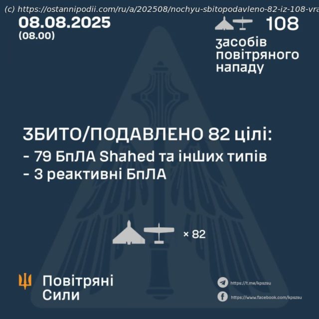С 20:30 7 августа противник атаковал 108 средствами воздушного нападения: 104 ударными БПЛА типа Shahed, беспилотниками-имитаторами различных типов, а также 8 скоростными (реактивными) БПЛА из направлений: Шаталово, Курск, Брянск, Приморско-Ахтарск – рф, Чауда – ТОТ Крыма.
