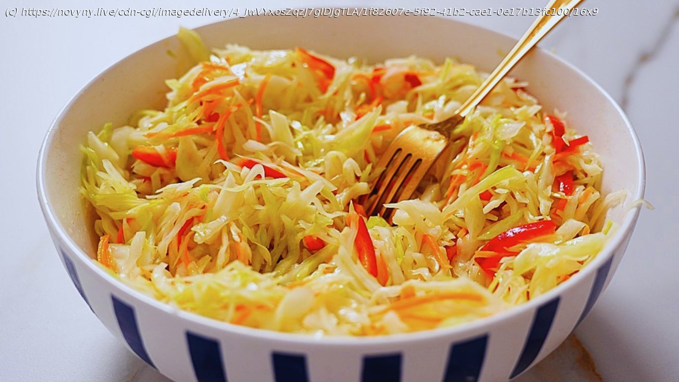 Нашинковать капусту не слишком тонко, чтобы сохранить приятную хрусткость.
