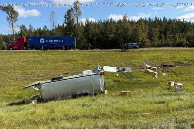 A truck carrying 21 rhesus monkeys overturned in a ditch near Heidelberg, Miss. on Oct. 28. The truck was wrecked and several loose primates were able to escape through a hole in the back door.